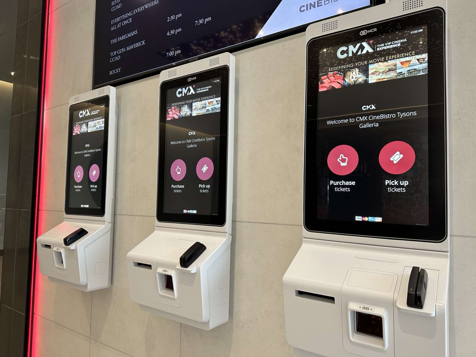 CMX CinéBistro (2001 International Drive, Suite 1700U) has officially opened at Tysons Galleria after a couple of delays last fall. The dine-in movie theater, which features a full bar and lounge, is located on the third floor of the mall’s redeveloped Macy’s wing.
