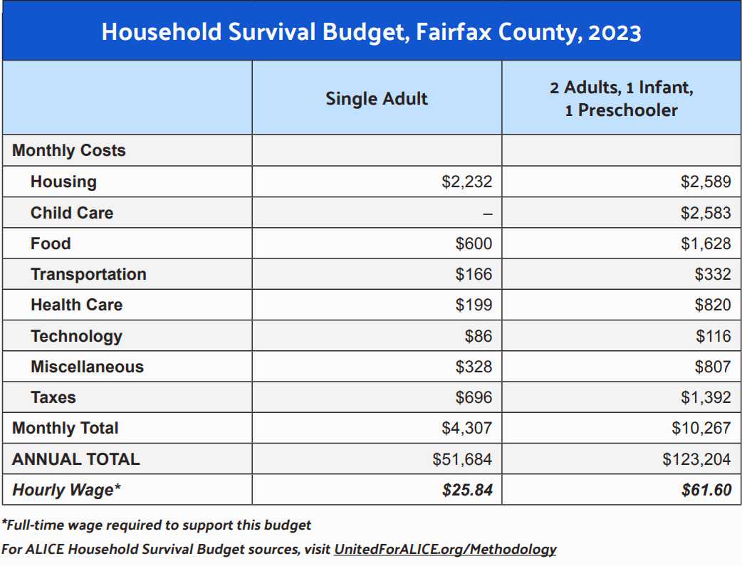 According to the report, the survival-budget figures for Fairfax County are even higher: $51,684 for a single-person household and $123,204 for a family of four, based on the most recent (2023) data that doesn’t fully capture the post-pandemic spike in inflation.