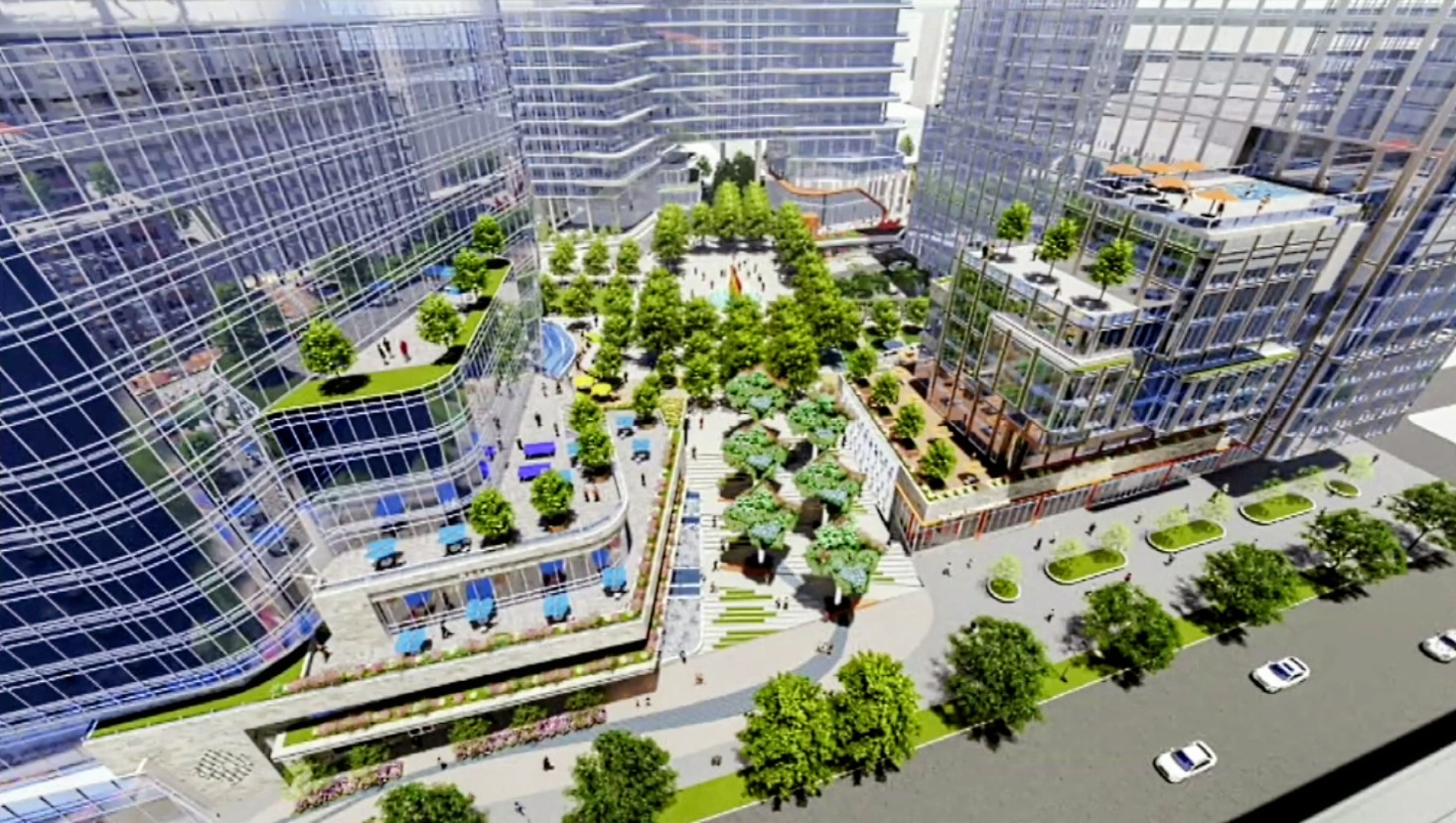 A central piazza area and gathering space would tie the buildings together. The plan also includes a 900-square-foot retail kiosk that could be used for pop-up shops and events.
