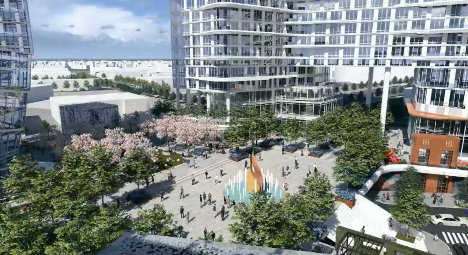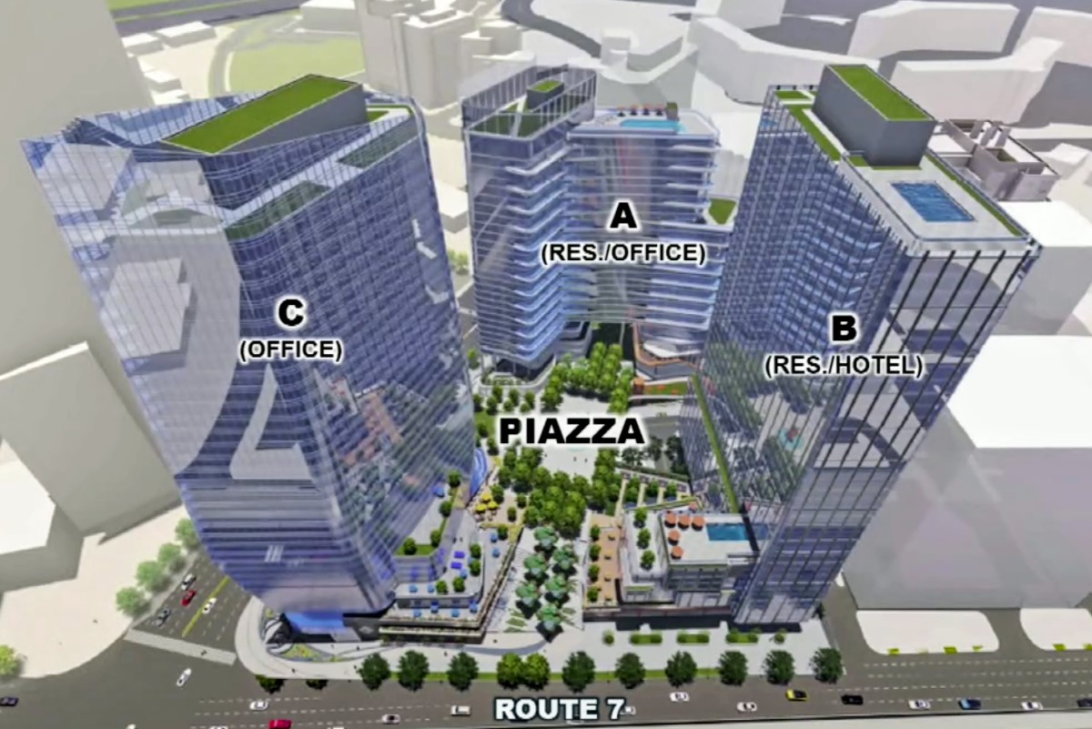The proposal calls for a trio of buildings — two rising 33 stories, the other 30 stories — with an European “Amalfi coast” theme on a parcel bounded by Leesburg Pike, Spring Hill Road, Broad Street and West Street.