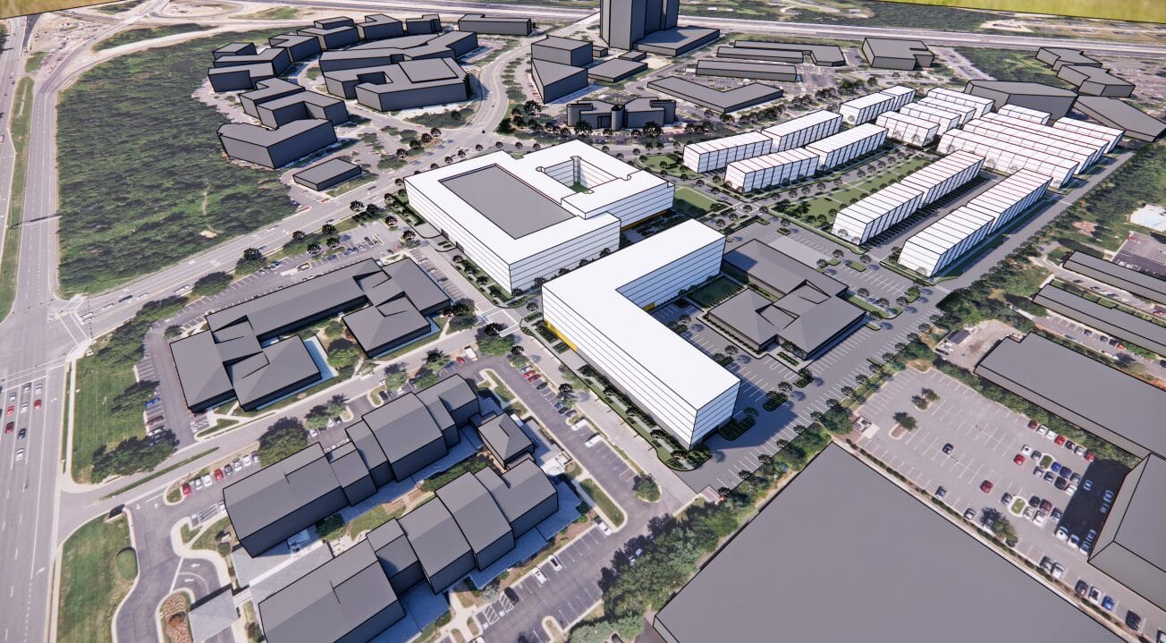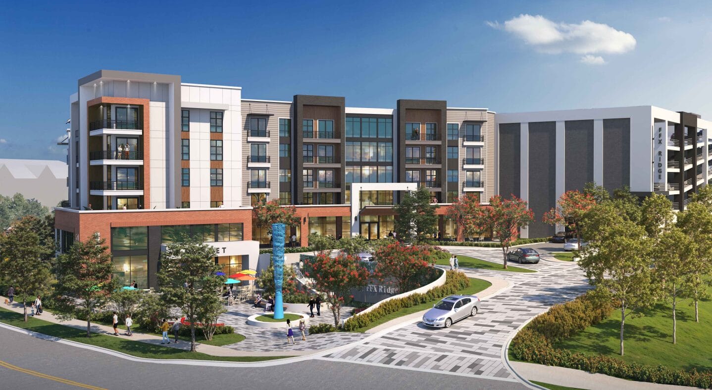 Dubbed “Fairfax Crossing,” the neighborhood would include 140 affordable dwelling units for those earning 60% of the area median income, and up to 20,000 square feet of ground-floor retail or amenity space would be provided in the multifamily buildings.