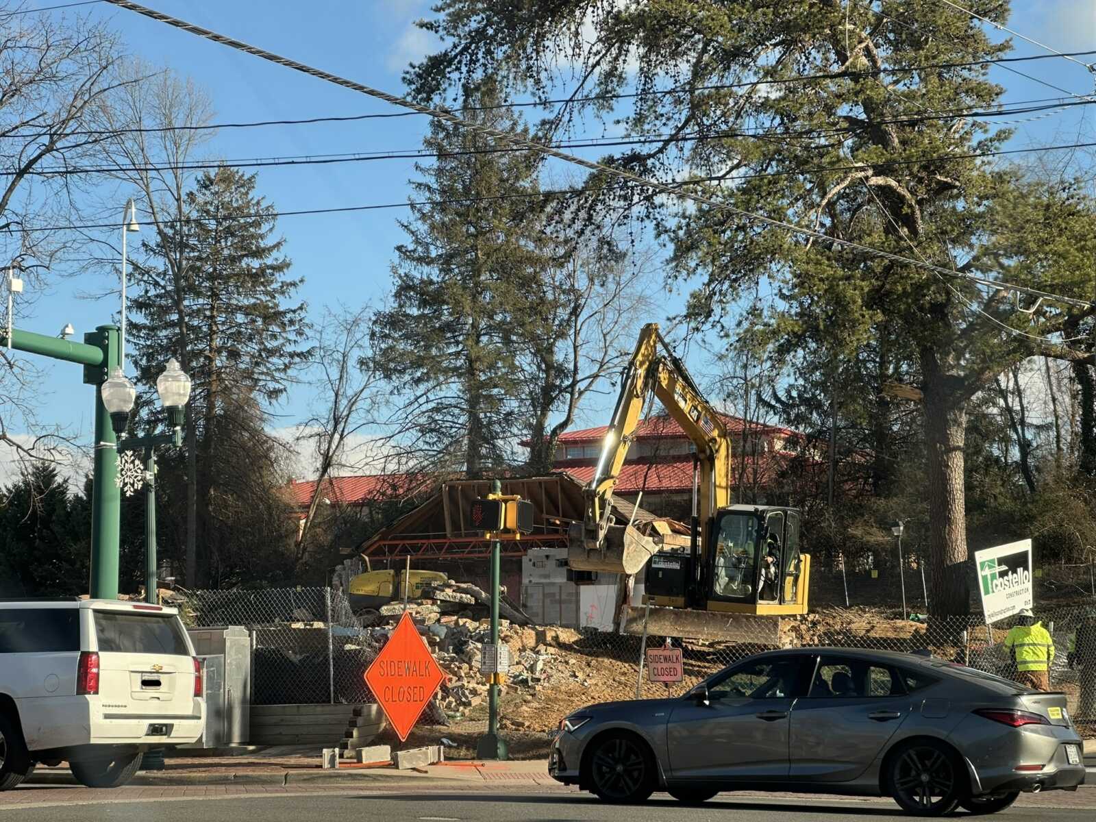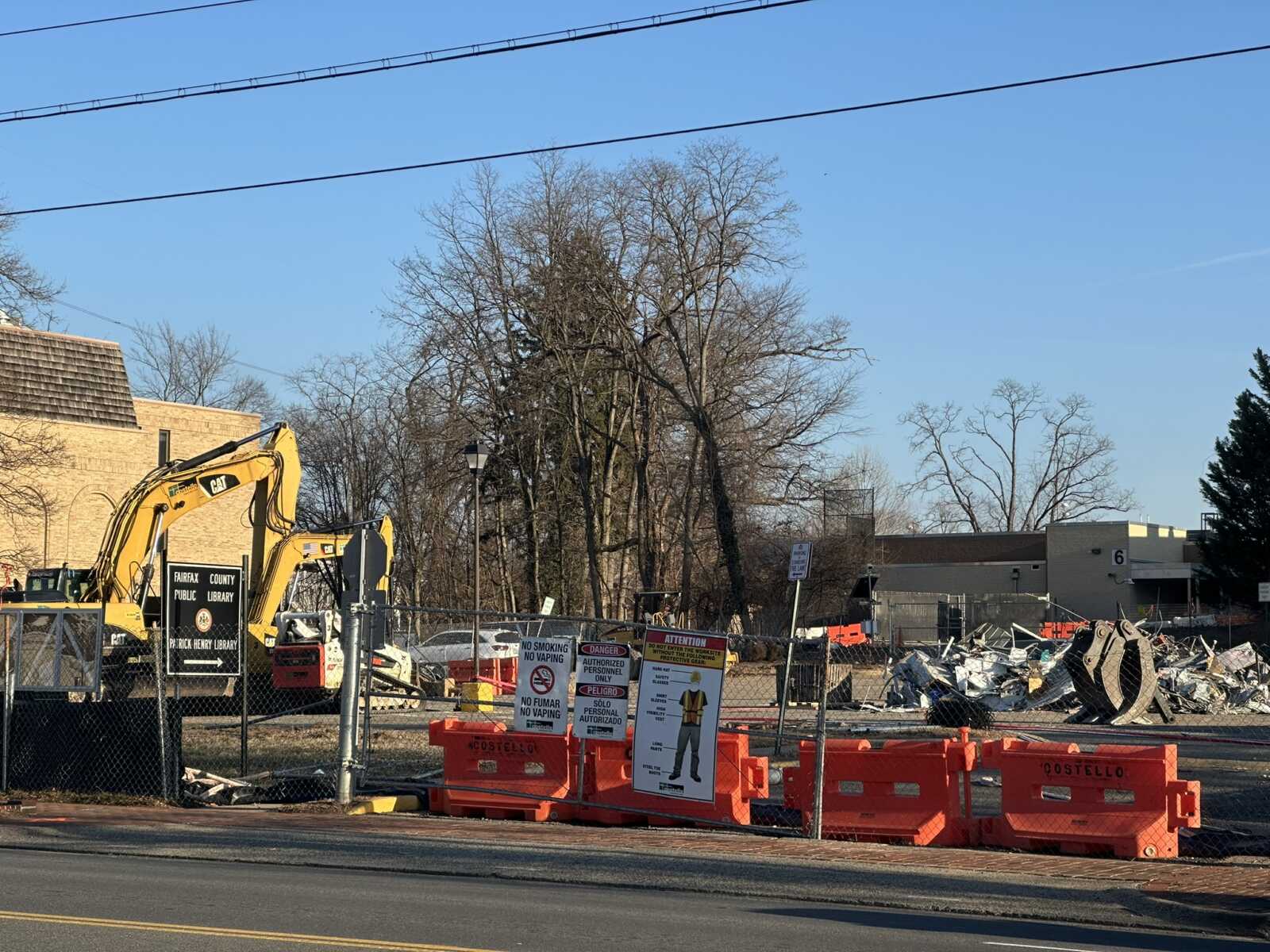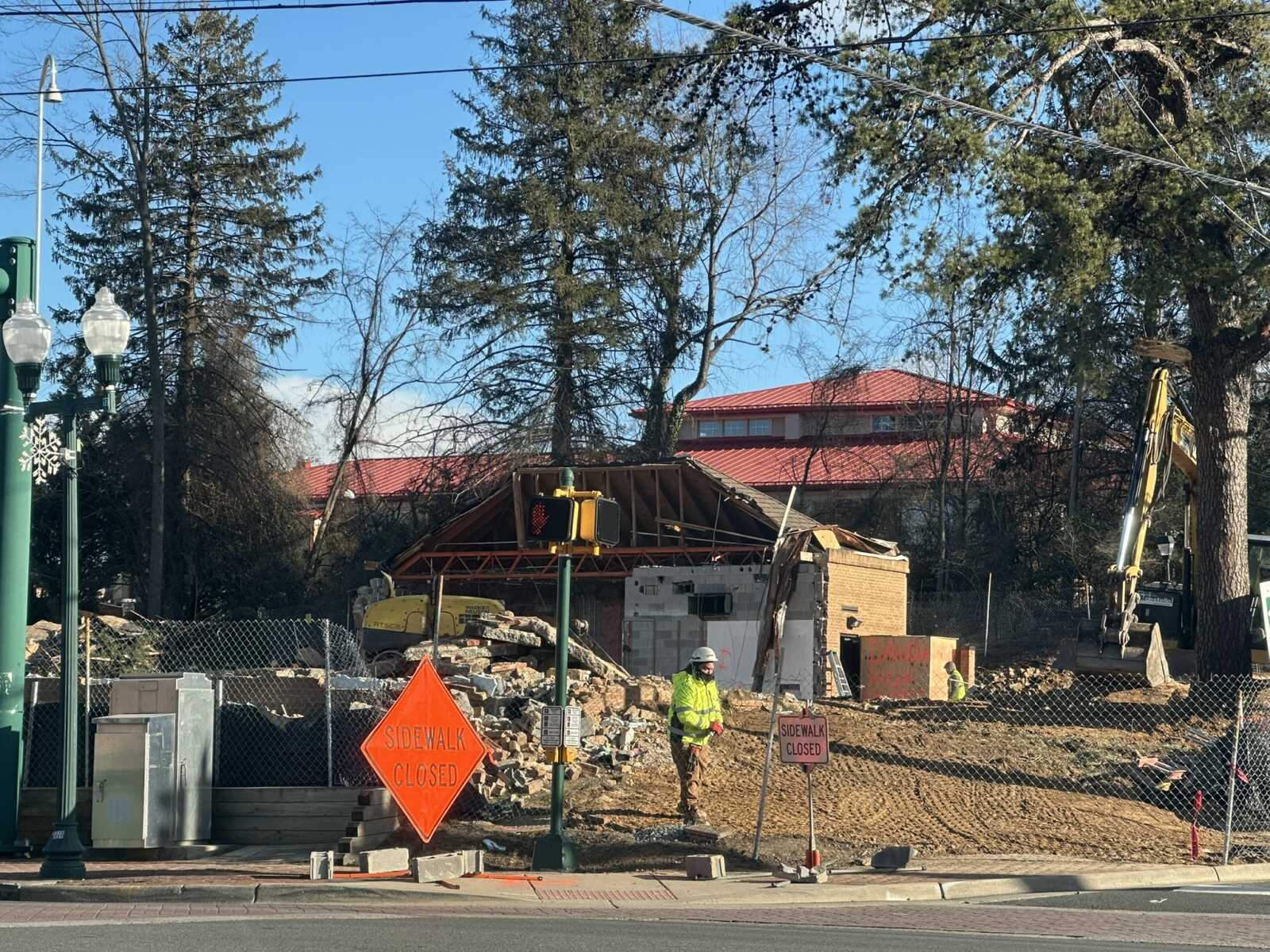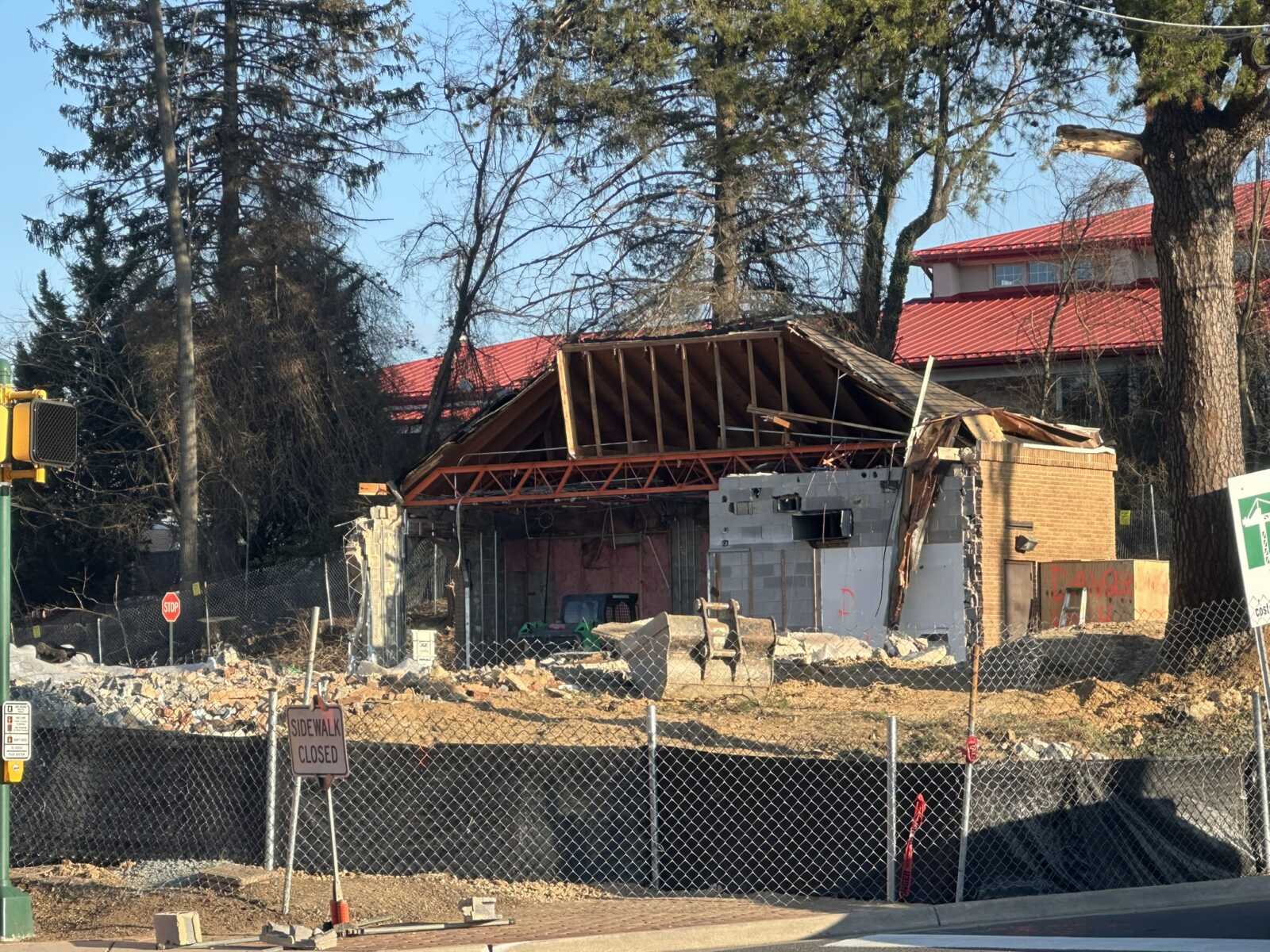 As of last Friday (Jan. 2), the rear-most portion of the building remained standing, its internal structure exposed, but everything else has been reduced to rubble. The site has been blocked off by construction fencing, and the sidewalk along Maple Avenue is closed.