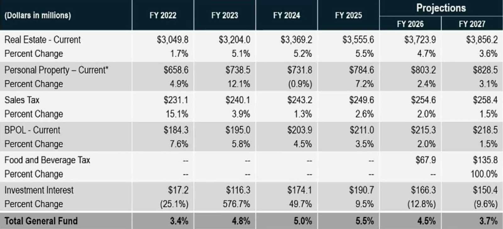 The budget package proposes maintaining the existing tax rate of $1.1225 per $100 assessed value. Because assessments are still projected to increase by 3.6% overall, largely from increases in the residential sector, total estimated real estate revenue would grow to $3.856 billion.
