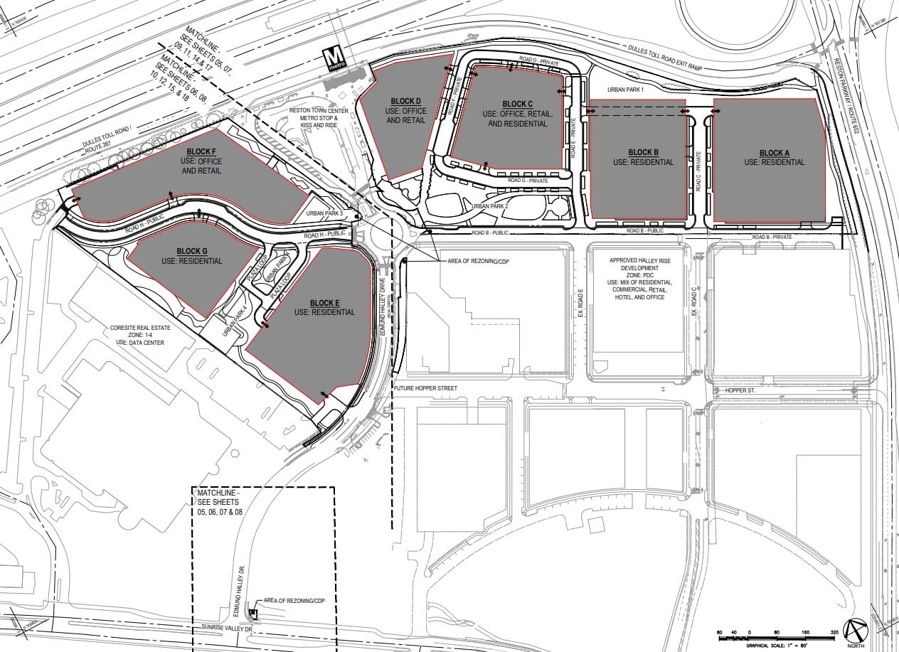 “In conjunction with the adjacent Halley Rise development to the south, the Property will form a unified, transit-oriented district centered around the Town Center Station,” Walsh Colucci Lubeley and Walsh land use attorney Andrew Painter wrote in a March 5 statement of justification for the rezoning application.