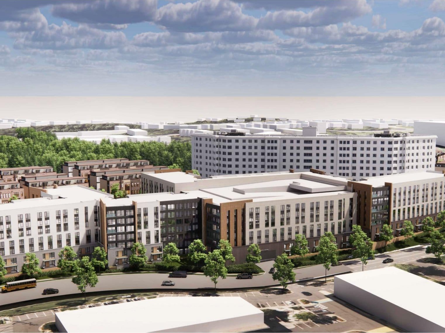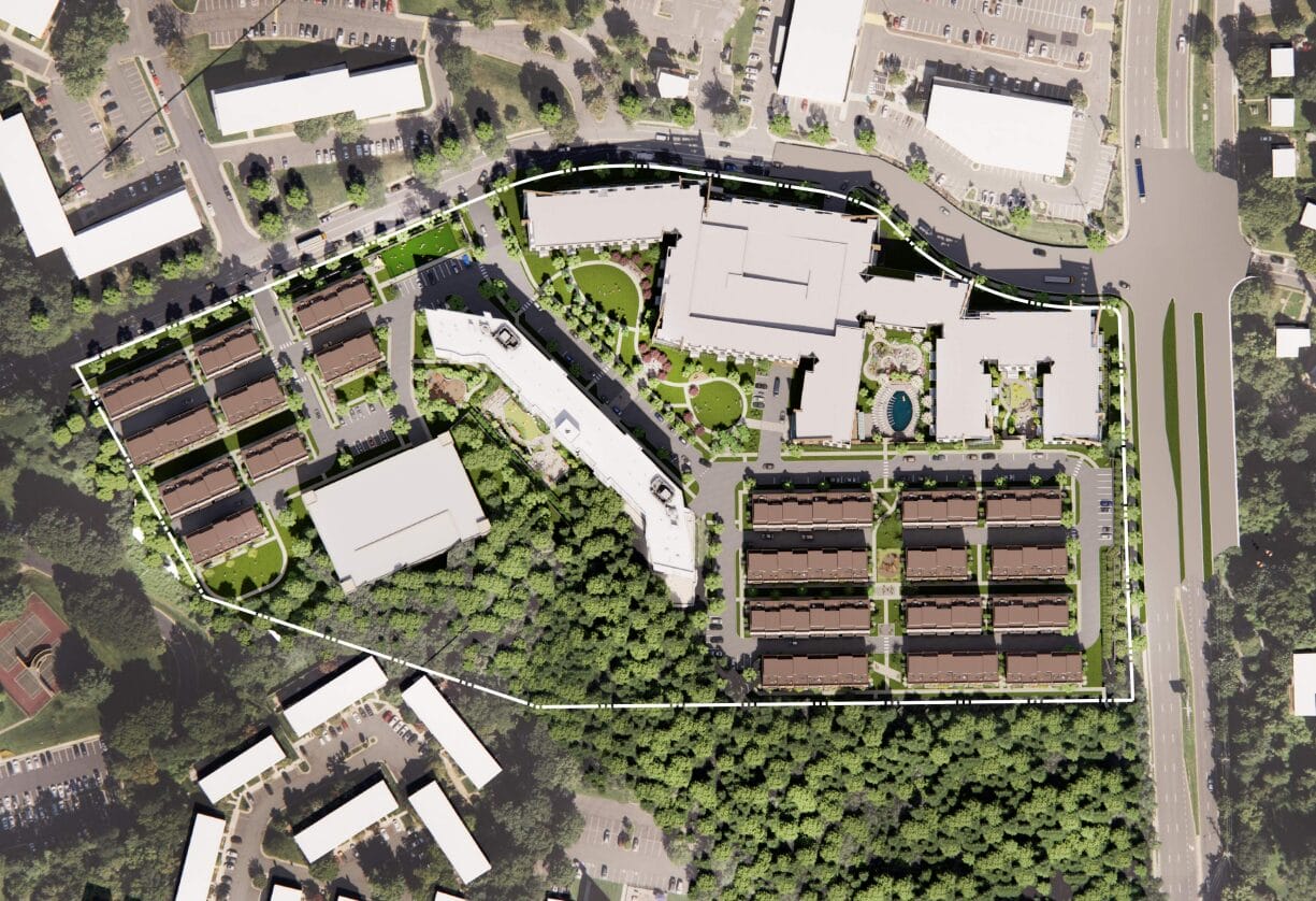 Under the proposed development plan, the existing apartment building would be retained, but its current surface parking lot would be replaced by a second apartment building and other housing options. A new parking garage would then be constructed elsewhere on the property for residents.