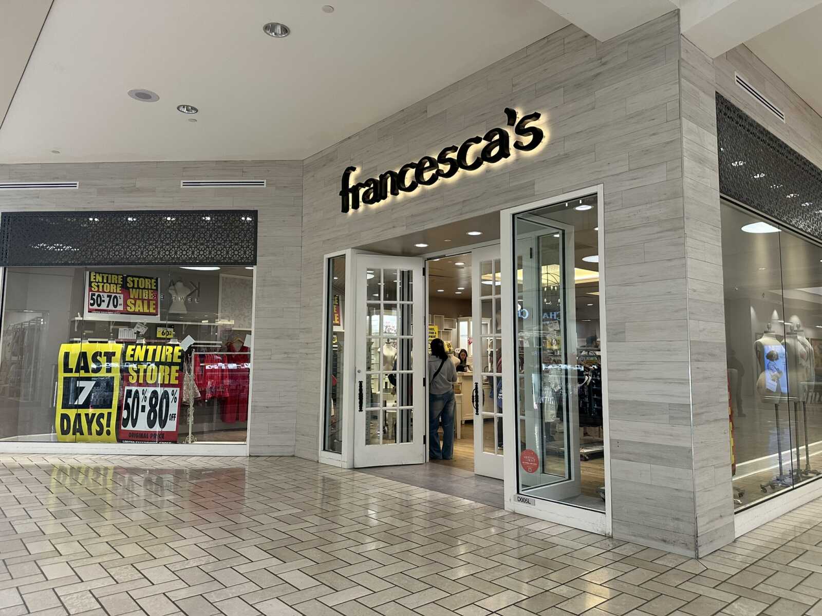 The clothing store Francesca’s is also in its final days of business after filing for bankruptcy in early February. The Tysons store, located on the mall’s first floor near Wasabi, has been advertising closing sales for more than a month.