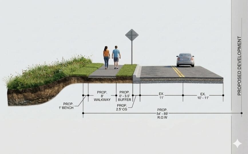 In addition to constructing an 8-foot-wide, approximately 900-foot-long asphalt walkway, the project will involve replacing existing driveway pipes and drainage ditches with a curb-and-gutter system, establishing a closed drainage network featuring inlets and underground piping.