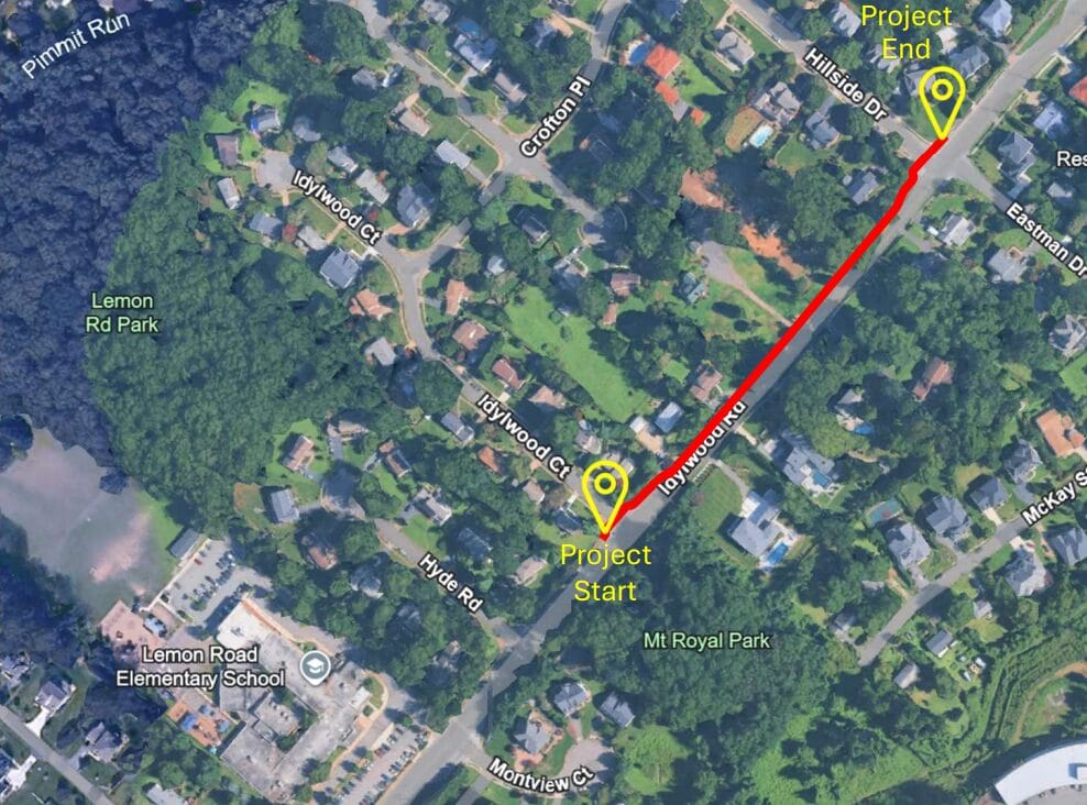 The project will replace existing sidewalk and asphalt trail segments to form a continuous walkway along the northwest side of the road, extending about 100 feet of sidewalk east of Idylwood Court and 170 feet of trail west of Hillside Drive.