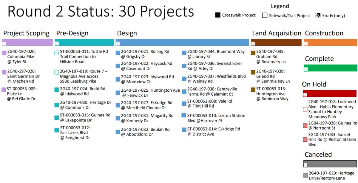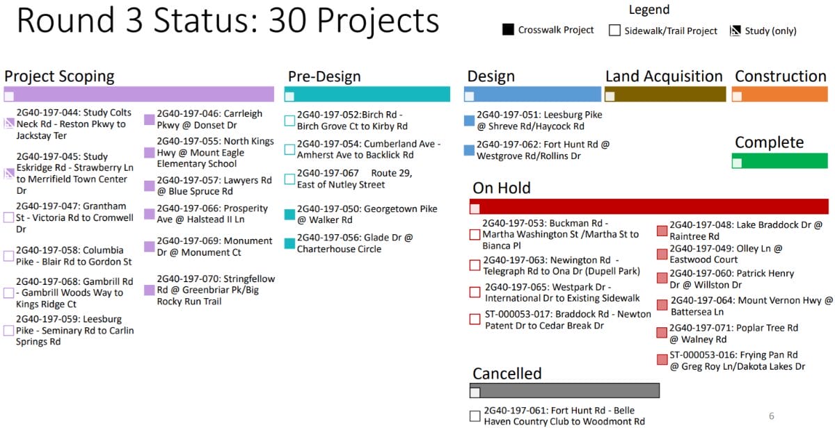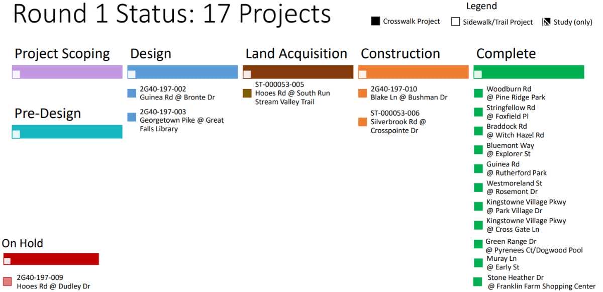 - Round 2: Featuring mostly crosswalk improvements that were “more complex” than the first round, about half the 30 projects are in design, three are on hold, one has been picked up by the Virginia Department of Transportation and the remainder are in preliminary stages.