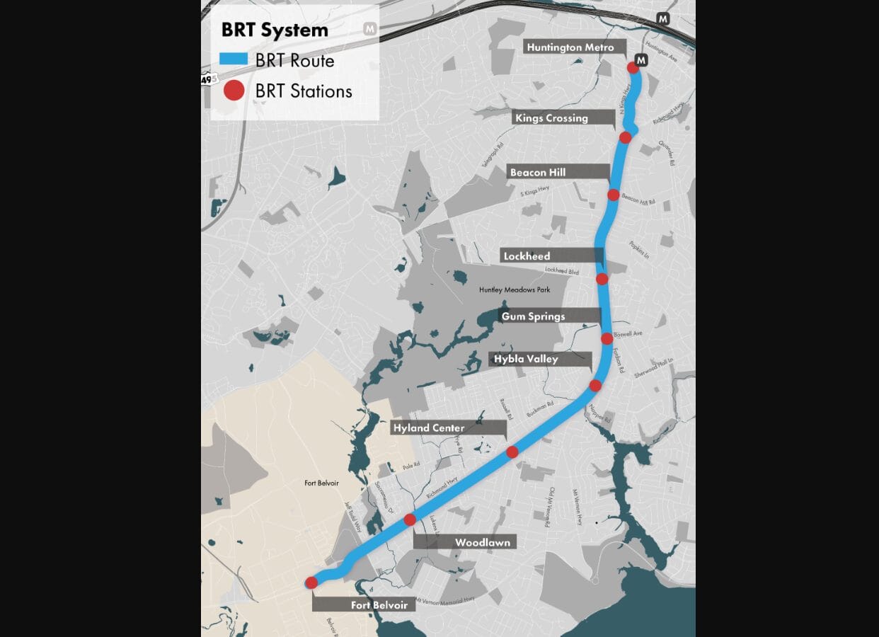 Named “The One,” the Richmond Highway BRT will serve a 7.4-mile stretch from the Huntington Metro station down to Fort Belvoir. A study conducted by the state in 2013 to 2015 found that a bus rapid transit system would be the best short-term option for providing more reliable and frequent transit service in the corridor.