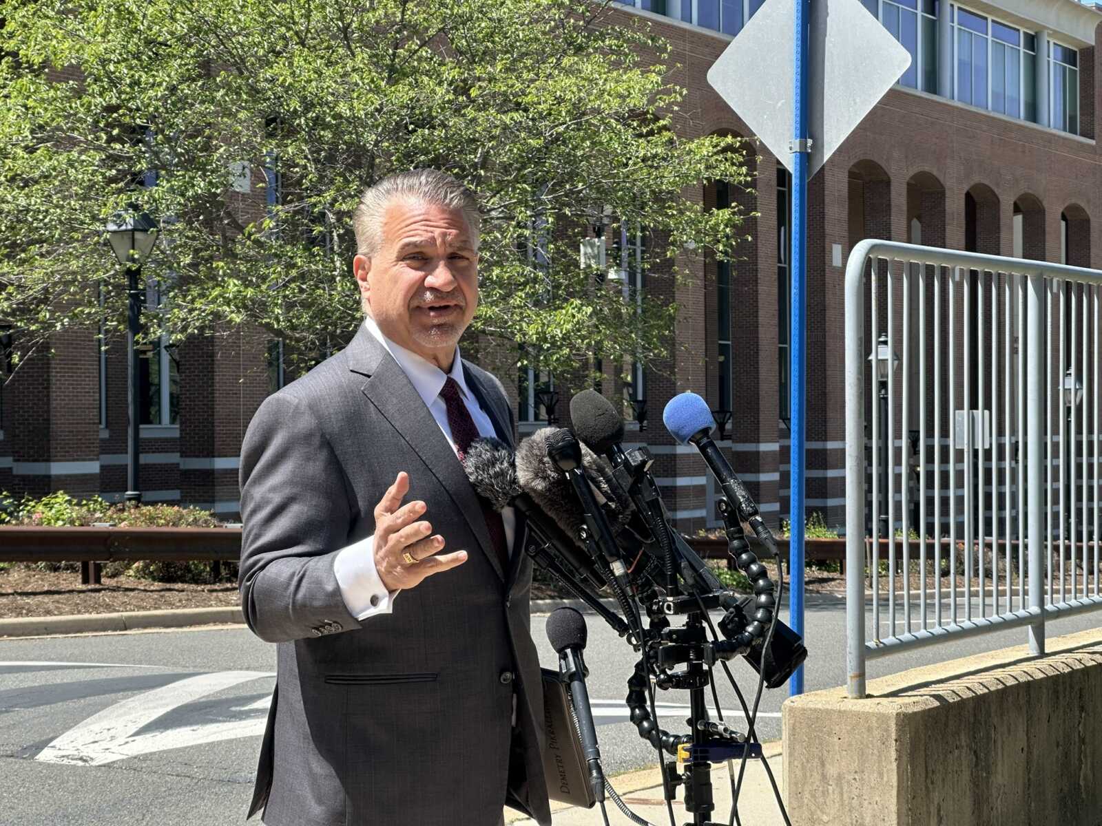 Attorney Demetrios Pikrallidas speaks on behalf of one Fairfax High School student assaulted by Israel Flores Ortiz outside the Fairfax County Courthouse (staff photo by Angela Woolsey)