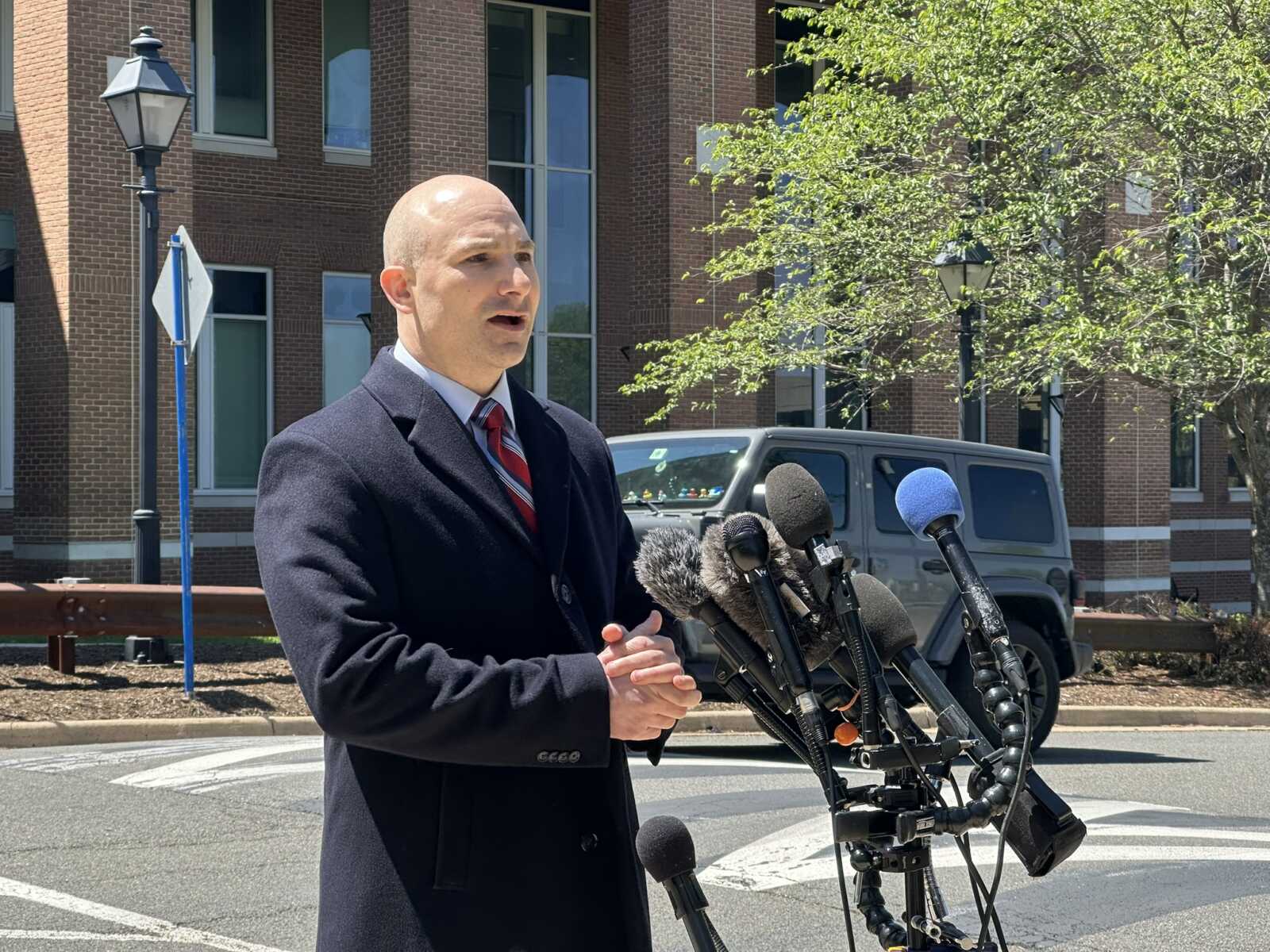 Fairfax County Commonwealth’s Attorney Steve Descano speaks outside the Fairfax County Courthouse following a Fairfax High School student’s sentencing for assault (staff photo by Angela Woolsey)