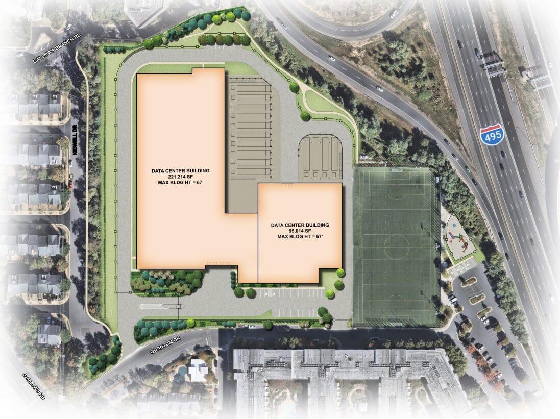 The buildings would be also located just 107 to 131 feet away from the Reserve at Tysons Corner apartments to the south and the Heritage Point Townhouses to the west — under the county’s 200-foot minimum setback for data centers from residential areas.