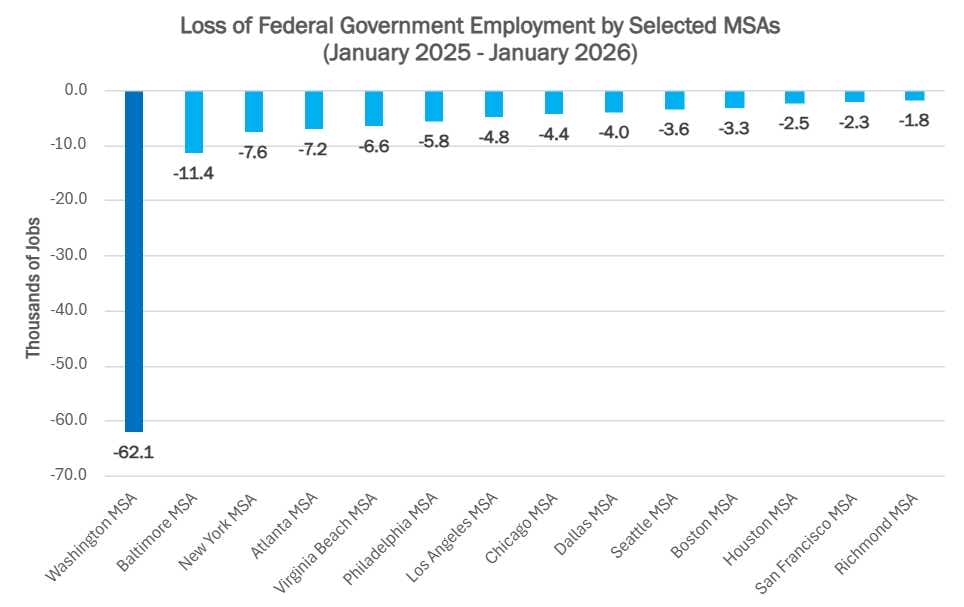 The 62,100 federal job losses are part of roughly 103,900 jobs lost in the region overall from January 2025 to January 2026. Fairfax County’s unemployment rate jumped from 2.7% to 3.8% over that time frame. Loudoun County’s rate rose from 2.7% to 3.7%, while Prince William’s increased from 2.9% to 3.8%.