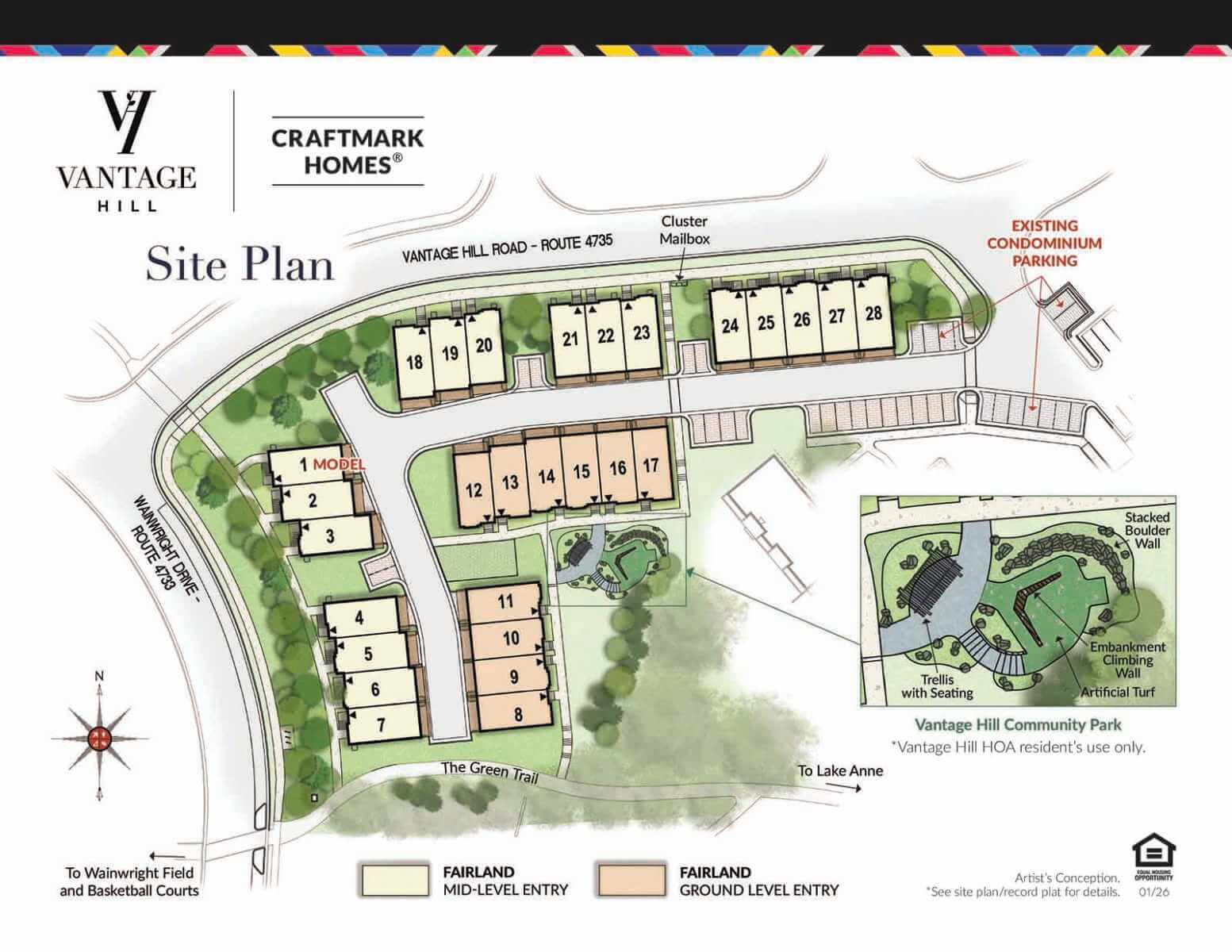 Approved by the Fairfax County Board of Supervisors in December 2022, the new townhouses are replacing what used to be surface parking and an abandoned swimming pool in the southwestern corner of the Vantage Hill Condominiums.