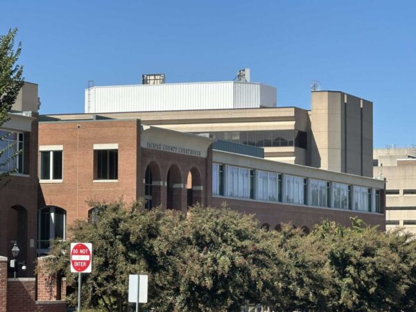 The Fairfax County Courthouse behind trees (staff photo by Angela Woolsey)