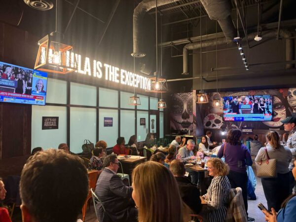 Democrats watch governor-elect Abigail Spanberger deliver a victory speech during a watch party for the Nov. 4, 2025 general election at Banditos in Fairfax (staff photo by Jared Serre)