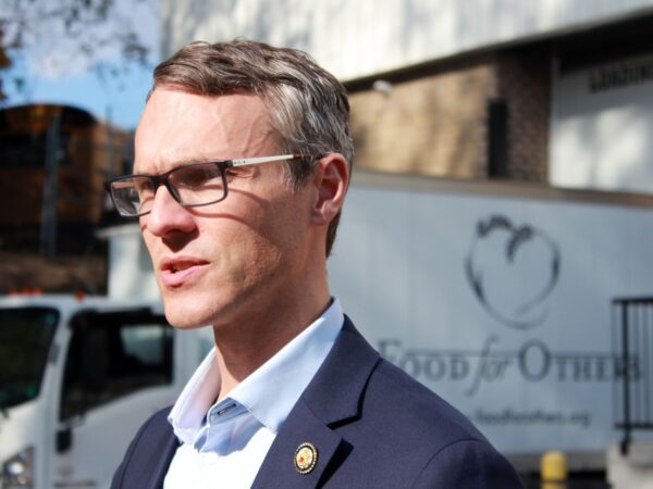 Rep. James Walkinshaw outside of Food of Others' food bank in Merrifield (staff photo by Jared Serre)