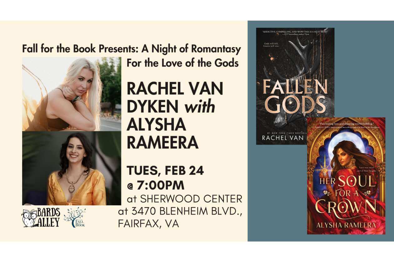 Romantasy fans unite! Fall for the Book presents an evening of mythological mischief featuring authors Rachel Van Dyken and Alysha Rameera, authors of the Norse-inspired fantasy “Fallen Gods” and the Sri Lankan-inspired fantasy “Her Soul for a Crown,” respectively.