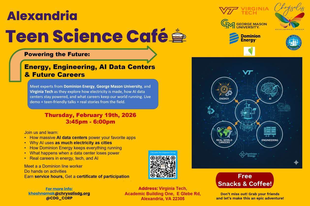 Chrysalis Development Group is hosting the Alexandria Teen Science Café: Powering the Future, an interactive event for high school students interested in science, engineering, energy, and future careers.