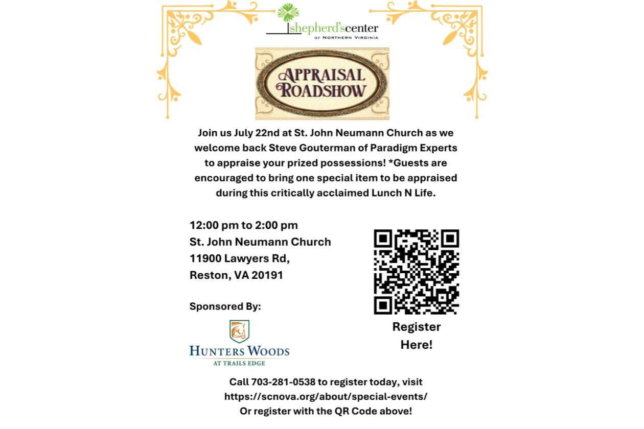 Have any special treasures laying around the house? Join SCNOVA for this exciting Lunch n Life! We will be inviting Paradigm Experts back this year to appraise your favorite pieces over lunch. Bring one special item and don’t miss what some would call “My favorite special event of the year! 12:00 to 2:00pm at St. John Neumann Catholic Church (11900 Lawyers Rd, Reston, VA 20191). $20.00 includes lunch and entertainment.