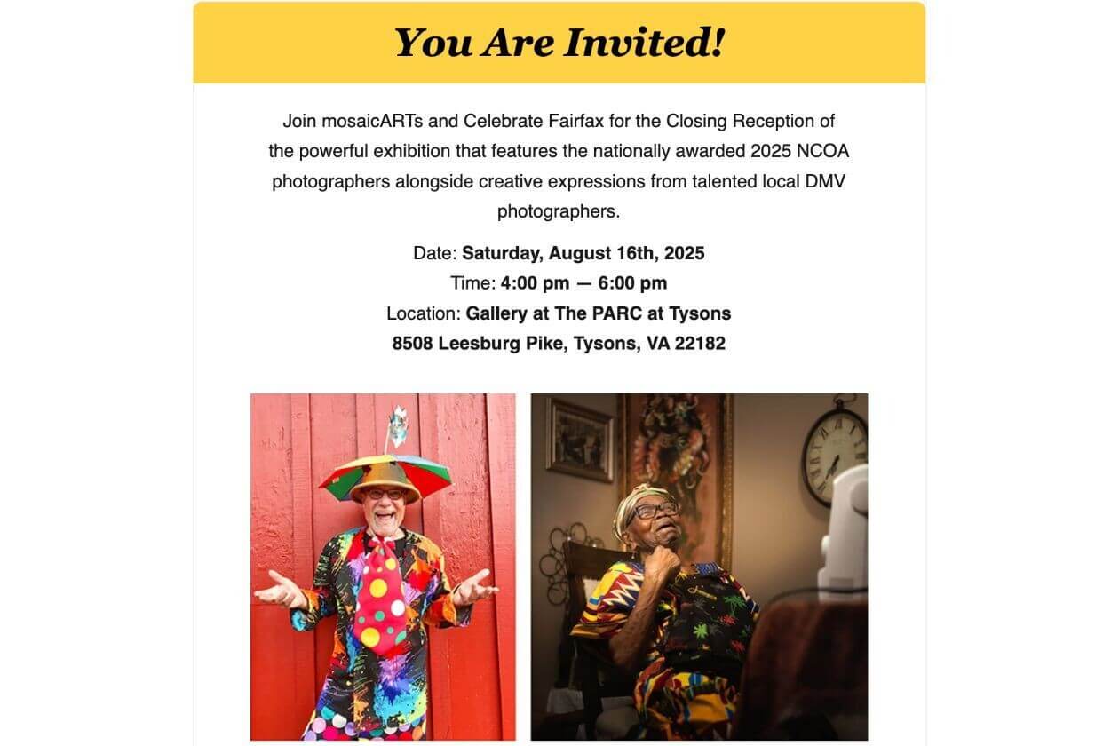 Join mosaicARTs and Celebrate Fairfax for the Closing Reception of the powerful exhibition that features the nationally awarded 2025 NCOA photographers alongside creative expressions from talented local DMV photographers.