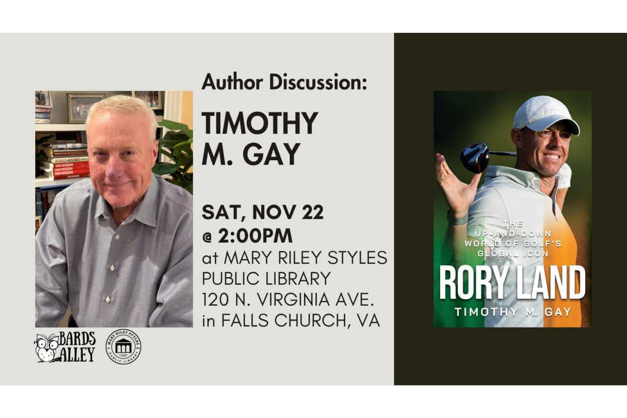 Join the Bards Alley booksellers at Mary Riley Styles Public Library in Falls Church for a talk by Pulitzer Prize-nominated local author Timothy M. Gay! His latest nonfiction book is “Rory Land: The Up-and-Down World of Golf’s Global Icon”, a look at the rise and eventual triumph of golf champion Rory McIlroy.
