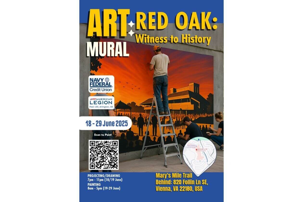 Navy Federal Credit Union and the American Legion are teaming up to capture the history of Vienna Virginia, as seen through a nearby Red Oak. The mural is on a long cement wall depicting the experience of a single Red Oak. During its 200 years, the Red Oak witnessed the evolution of Vienna, Virginia’s natural history, cultural, and flora.