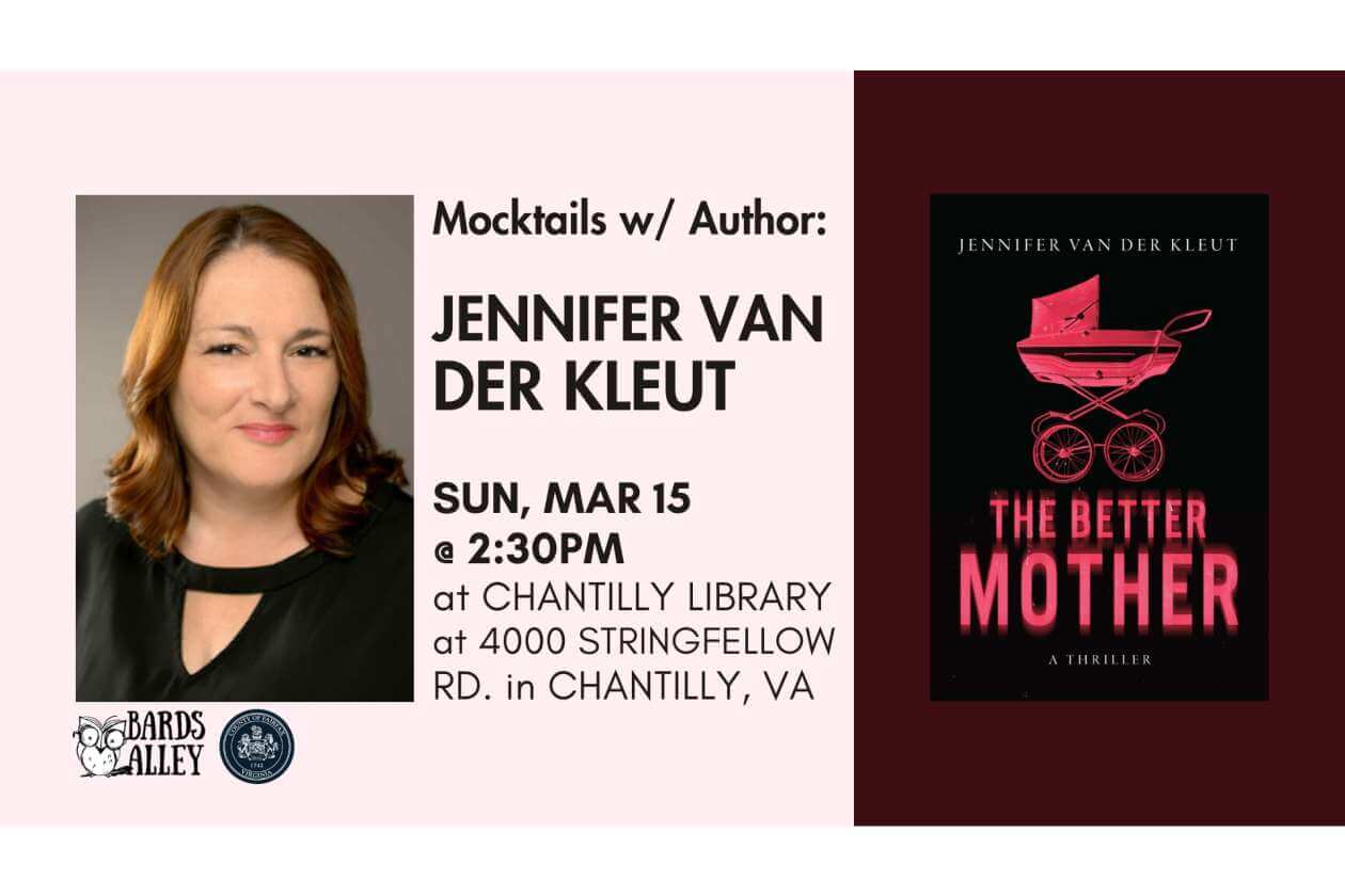 Join us at Chantilly Regional Library for mocktails with local author Jennifer van der Kleut, inspired by her debut “The Better Mother.” You’ll have a chance to chat with her about books, writing, publishing, whatever!