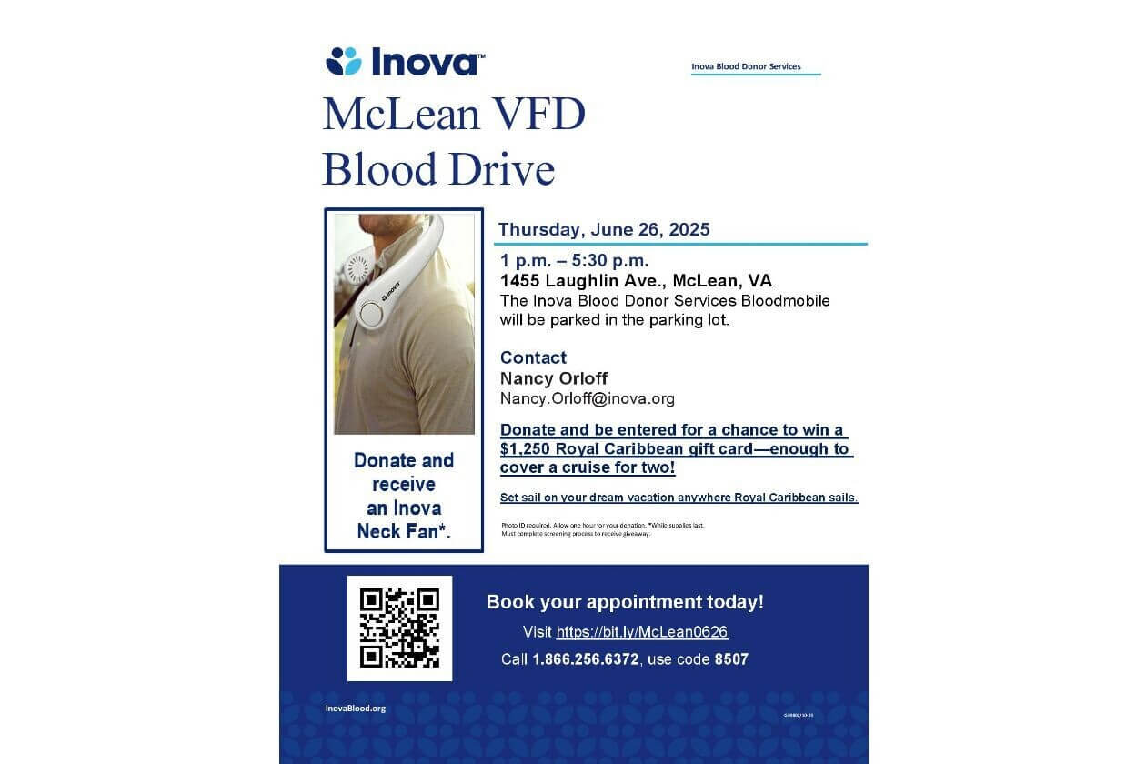 Donate blood and be entered for a chance to win a $1,250 Royal Caribbean gift card — enough to cover a cruise for two! Sign up for the McLean Volunteer Fire Department-Inova blood drive on Thursday, June 26, from 1 p.m. – 5:30 p.m. at the station: 1455 Laughlin Ave., McLean, VA. Please consider helping our community replenish these vital blood supplies – and have a chance to win the cruise gift card!