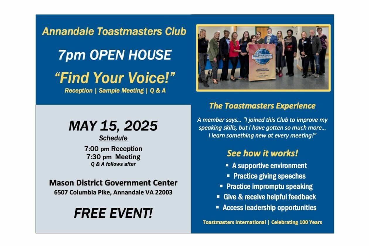 Are you ready to speak with confidence? We can help you find your voice! See how it works at Annandale Toastmasters Open House, on May 15. Members practice public speaking in a positive and friendly environment.