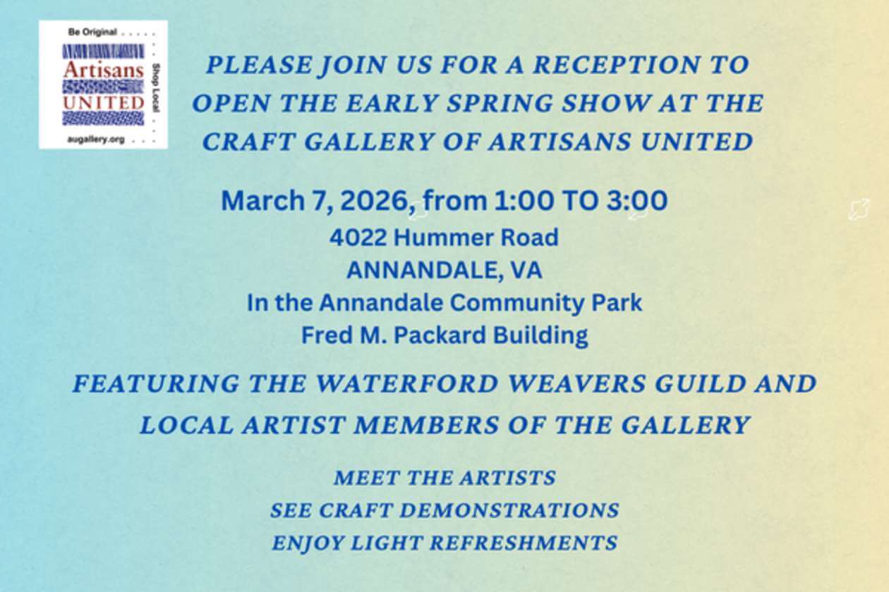 Join the Waterford Weavers Guild for the opening reception for the March/April show at the Craft Gallery of Artisans United on Saturday, March 7, 2026, from 1:00 to 3:00. The Waterford Weavers Guild is featured in addition to the permanent members of the Artisans United craft gallery. They are bringing some beautiful table runners, scarves, handbags, and much more, augmenting our stained glass, pottery, carved wood, painted objects, photography, paper-based crafts, needle-felting, several styles of jewelry, turned wood, and more, all handmade by local artists. We’ll have craft demonstrations and light refreshments, and you will get to meet some of our artists.