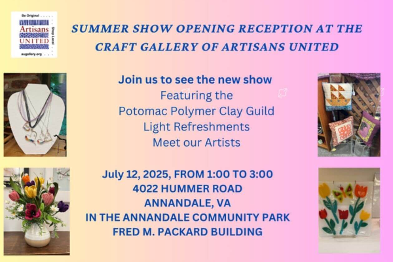 On Saturday, July 12th, join us from 1:00 to 3:00 for light refreshments while you enjoy an early look at the Summer Show at the Craft Gallery of Artisans United and meet some of our artists. We are featuring the Potomac Polymer Clay Guild in addition to our permanent artist members, and you can find wonderful unique gifts for any occasion. We hope you can make it. If not, come by another time. We are open Tuesday through Saturday 10-4 and Sunday 1-4. Find us in the Annandale Community Park (Fred M. Packard Center), 4022 Hummer Road, Annandale.