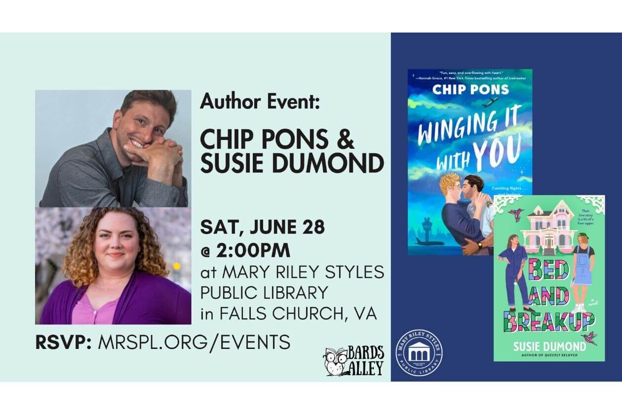 Celebrate Pride Month with the Bards Alley booksellers! We’re thrilled to join our friends at Mary Riley Styles Public Library in welcoming D.C. authors Susie Dumond and Chip Pons for a conversation about their new queer romance novels.