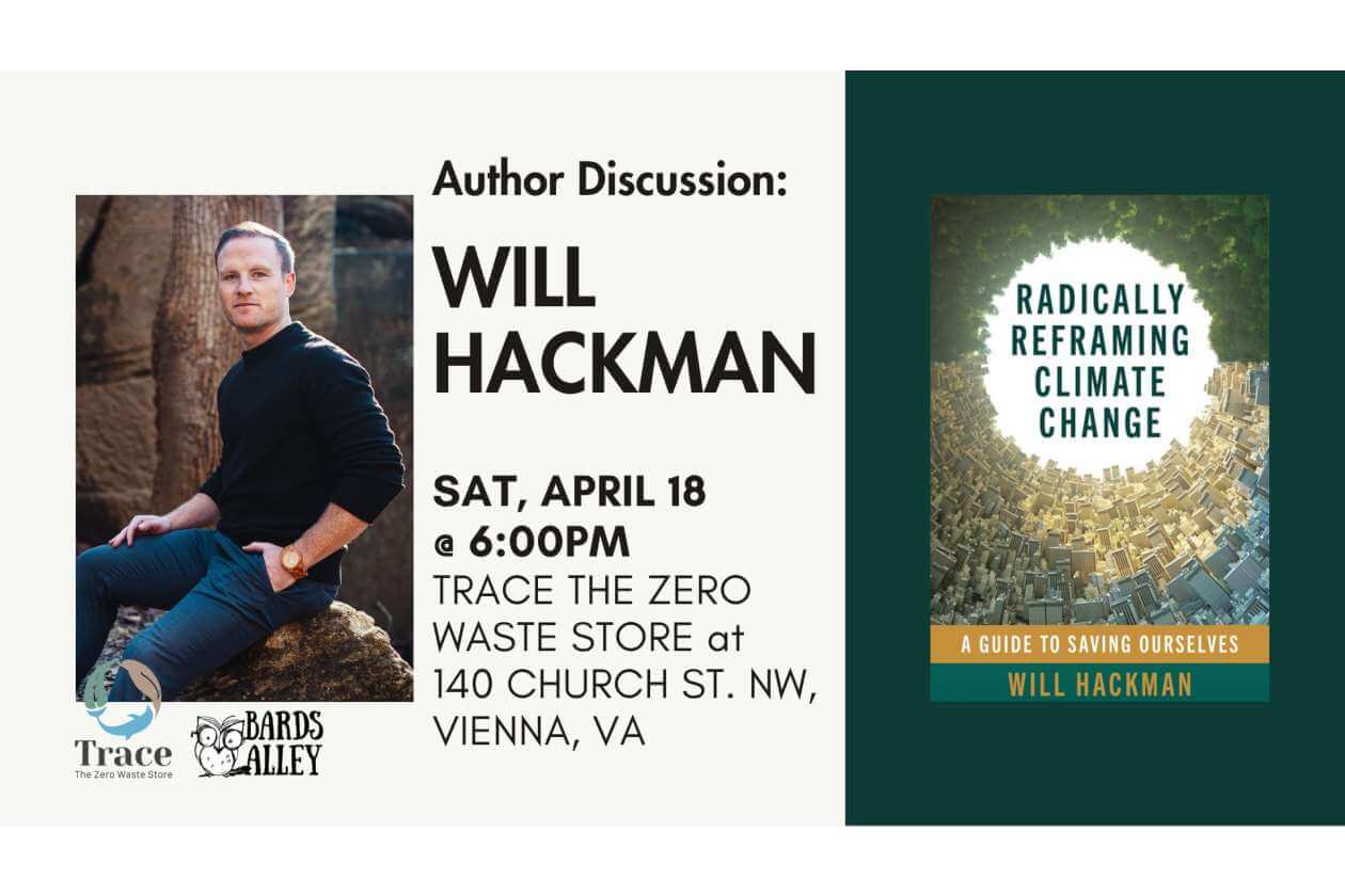 Bards Alley is thrilled to welcome Front Royal author and policy expert Will Hackman to Vienna for a talk about his book “Radically Reframing Climate Change: A Guide to Saving Ourselves.” Join us at Trace – The Zero Waste Store (located just a block away from Bards Alley on Church Street), where he will be in conversation with owner Mala Persaud!