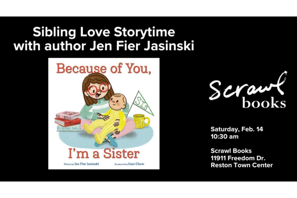 Join author Jen Fier Jasinski for the launch of her latest picture book Because of You, I’m a Sister, which captures the excitement, challenges, joys (and occasional conflicts!) of being a sibling. Because of You, I’m a Sister is the perfect gift for families welcoming a new baby or preparing their child for the arrival of a sibling– bring your own baby doll to enjoy the storytime!
