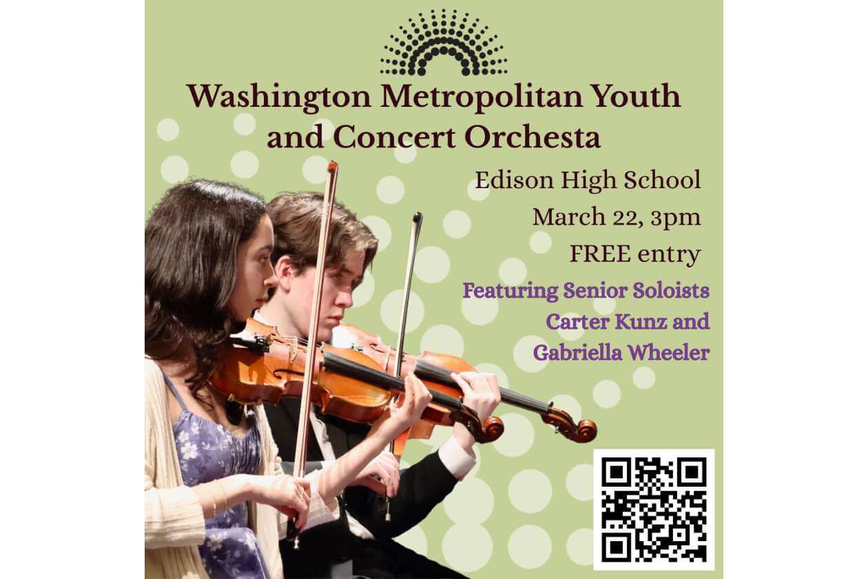 Celebrate the beginning of spring with the Washington Metropolitan Youth and Concert Orchestra on March 22, 3 pm at Edison High School! This concert is free and open to the public. No ticket required. Watch our talented youth perform Cello Concerto Mvt. I by Edward Elgar featuring Senior Soloist Carter Kunz, March of the Priests from “Athalie” by Felix Mendelssohn, and Viola Concerto Mvt. III by Johann Stamtiz featuring Senior Soloist Gabriella Wheeler.