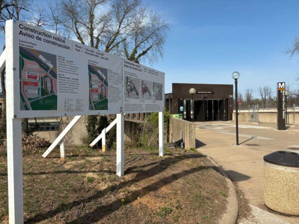 A notice outside the West Falls Church Metro station for construction on new roads, bus facilities and a parking garage renovation (staff photo by Jared Serre)